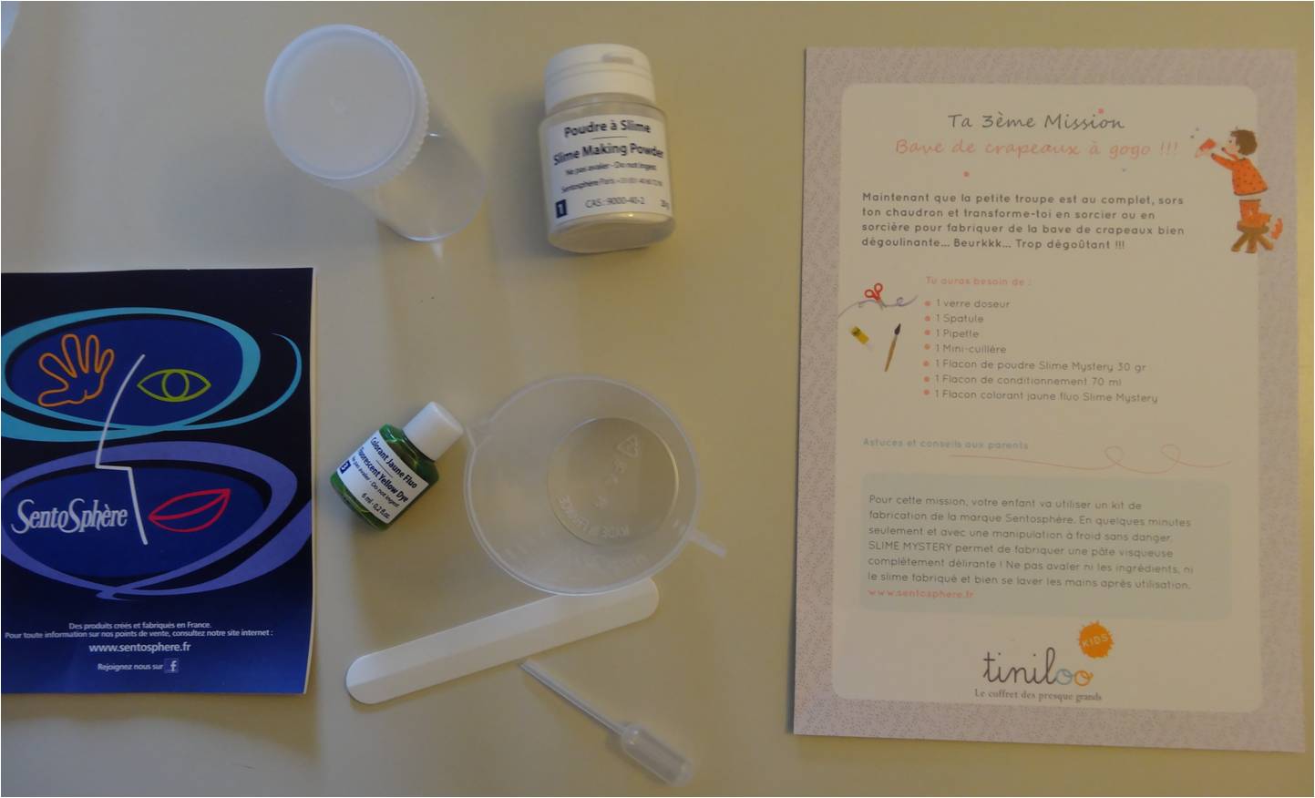 Dans cette mission, l'enfant se sert du kit de fabrication SLIME MYSTERY de la marque Sentosphère. En quelques minutes seulement et avec une manipulation à froid sans danger, il permet de fabriquer une pâte visqueuse complètement délirante !