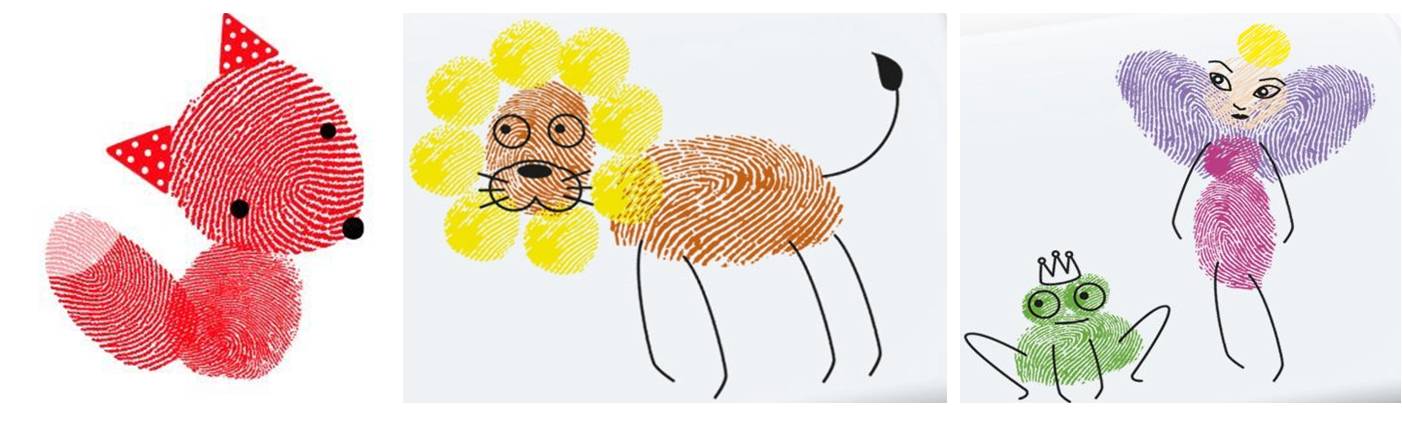 Il suffit de tremper les doigts dans un encrier, puis d'appliquer les empreintes de manière à créer des formes. Quelques coups de feutres permettent d'ajouter les yeux, jambes, cornes, roues, etc... qui manquent pour en faire de rigolos personnages, animaux ou véhicules.