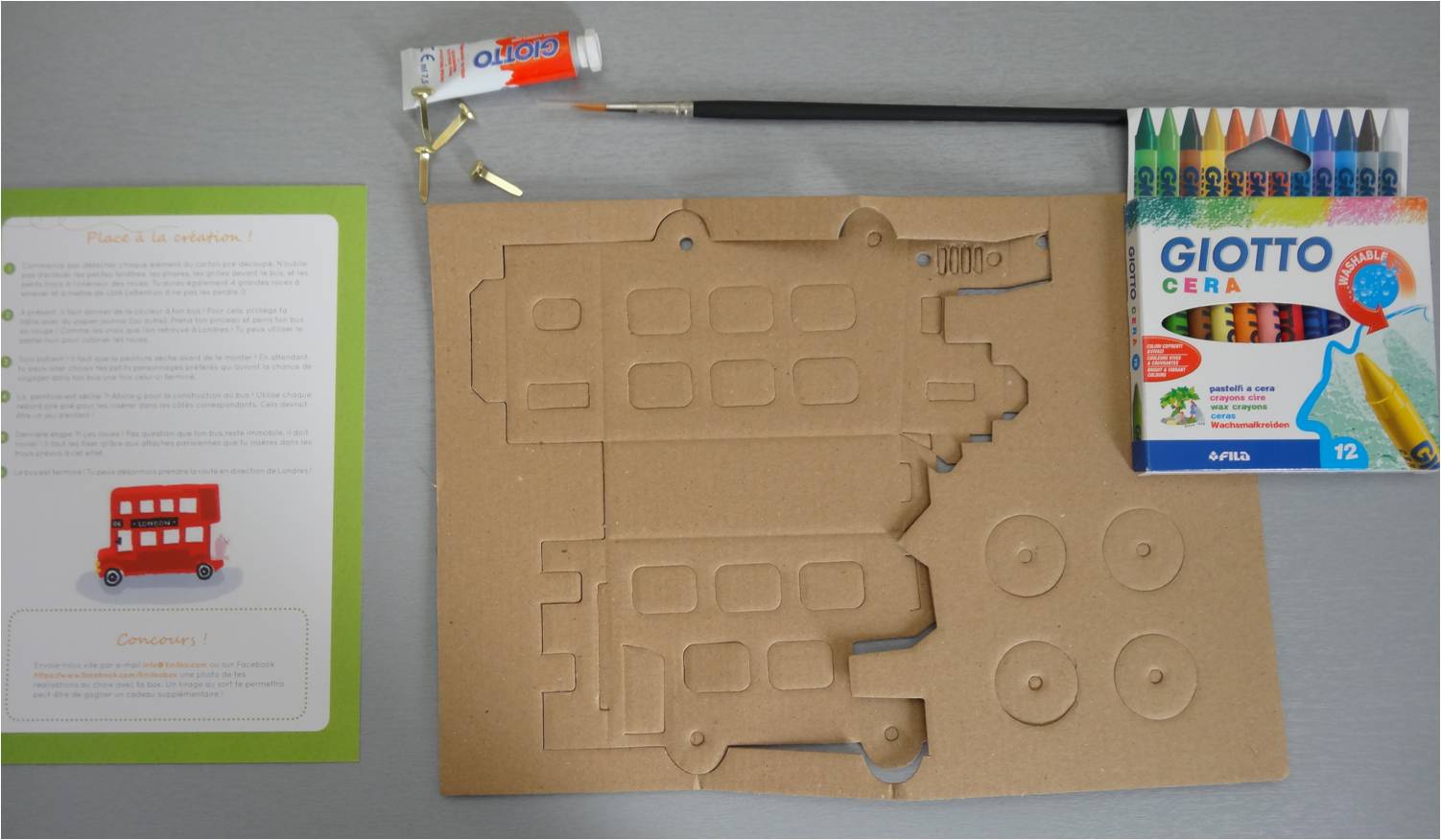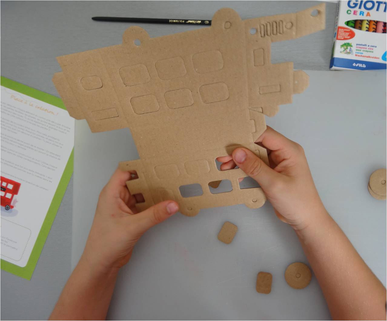 1. Prend ton carton pré-découpé et appuie sur les bords afin de sortir ton bus ! N’oublie pas d’enlever les petites fenêtres, les phares, les grilles devant le bus, et les petits trous à l’intérieur des roues. Tu auras également 4 grandes roues à enlever et à mettre de côté (attention à ne pas les perdre !)