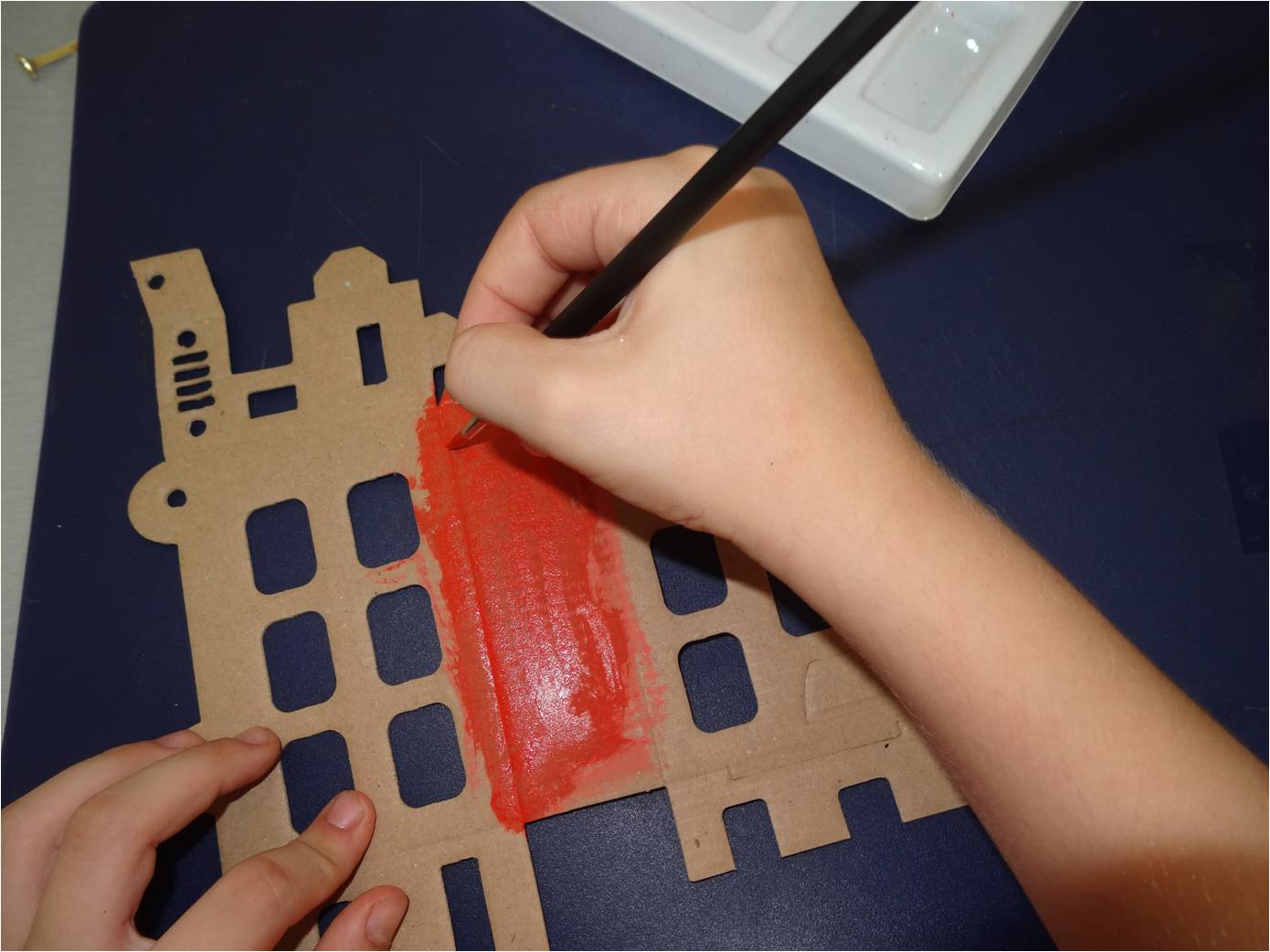 2. Tu vas devoir peindre ton bus et colorier ses roues ! Pour cela, protège ta table avec du papier journal (ou autre). Prend ton petit pinceau et peins ton bus en rouge ! Comme les vrais que l’on retrouve à Londres ! Tu peux utiliser le pastel noir pour colorier tes roues.