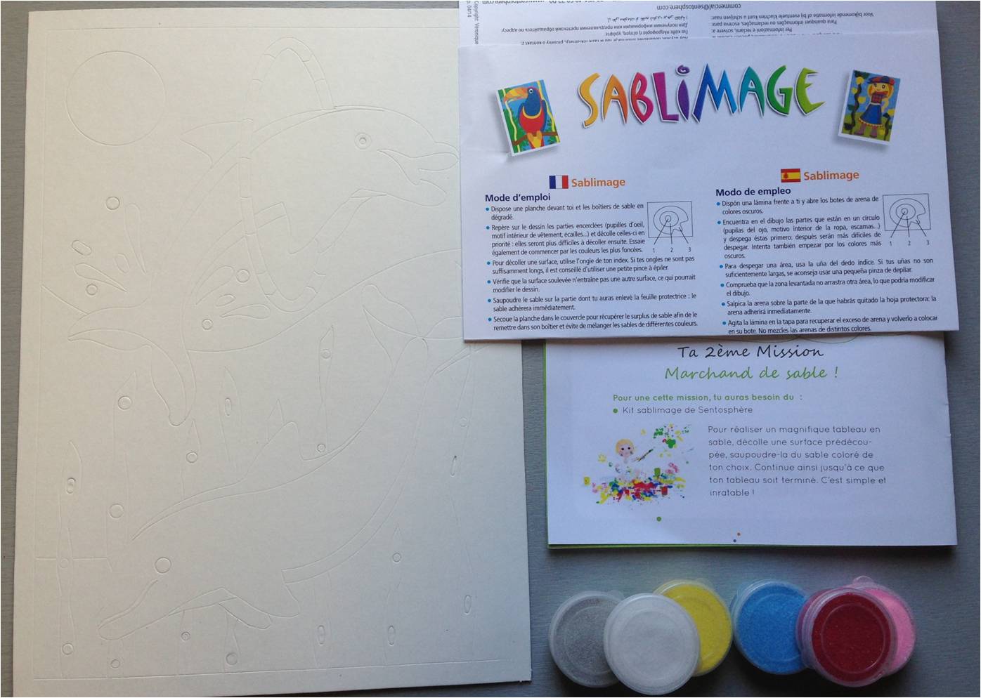 - Kit sablimage de Sentosphère comprenant un tableau autocollant, des sables colorés et le mode d'emploi.