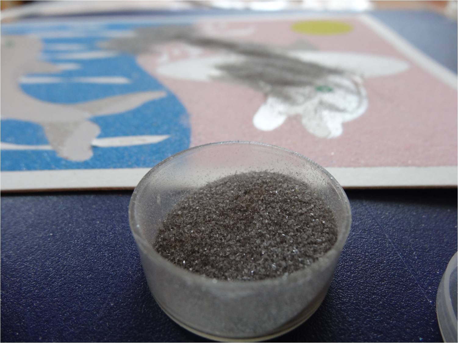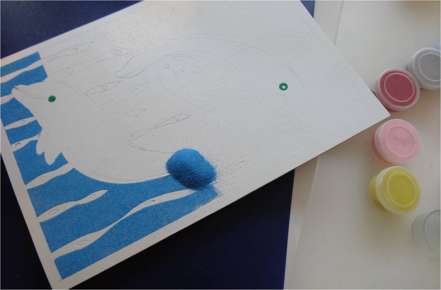 - Saupoudre le sable coloré de ton choix sur la partie que tu as décollée et tapote ta feuille pour enlever l'excédent.
