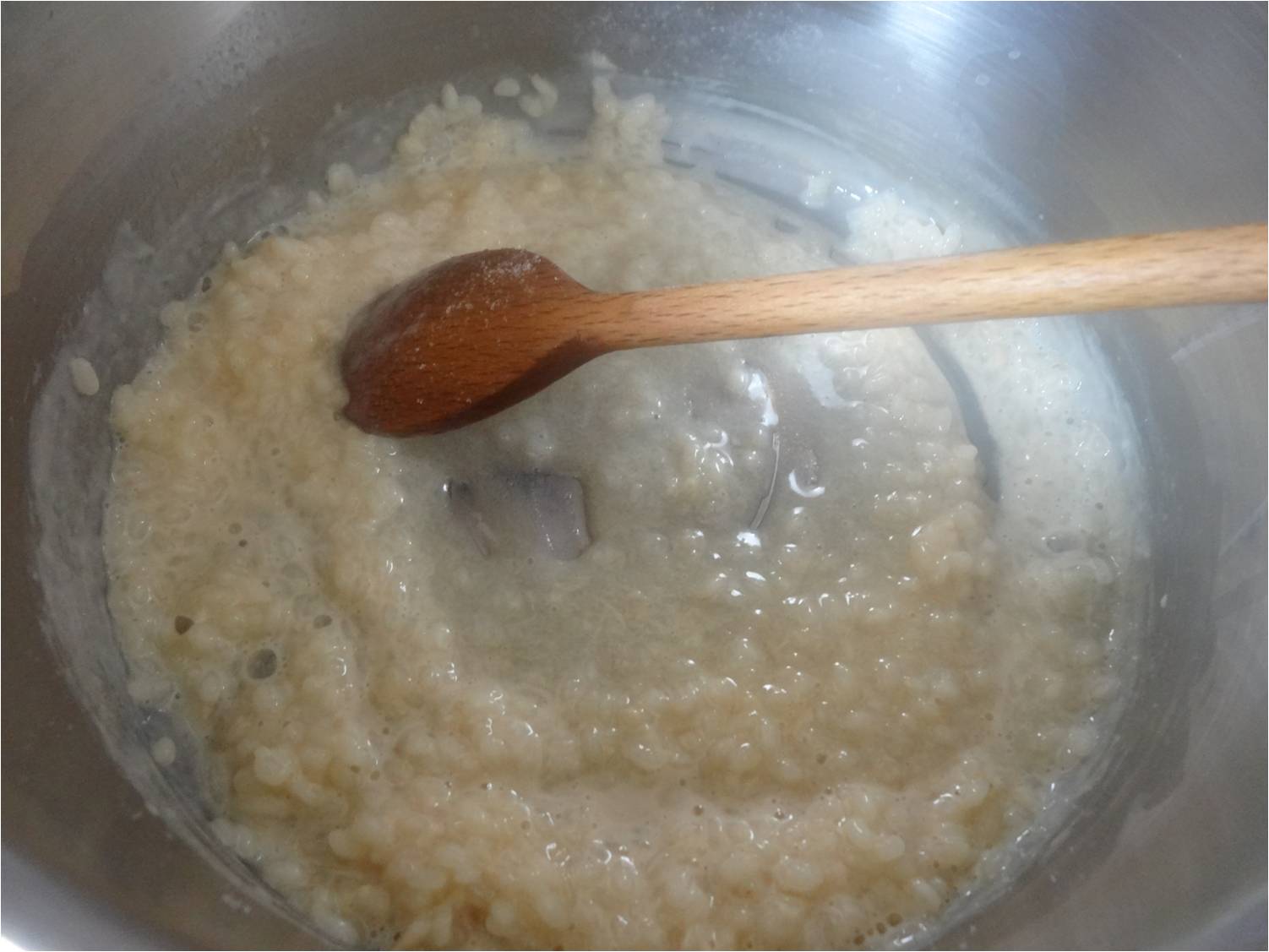 Tu peux utiliser une cuillère en bois et remuer de temps en temps pour que ça ne colle pas ! A la fin, il ne doit plus rester de liquide.
