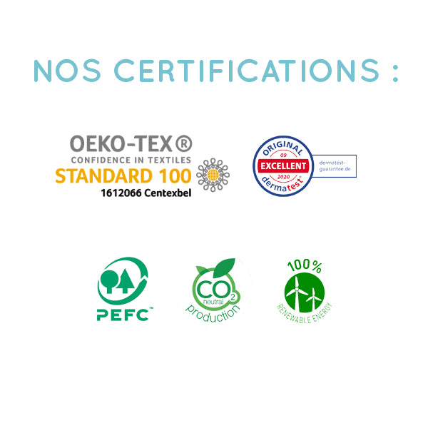 Nos couches sont certifiées Oeko-Tex® Standard 100 pour garantir l’absence de substances nocives, et PEFC pour une gestion responsable des fibres utilisées.
