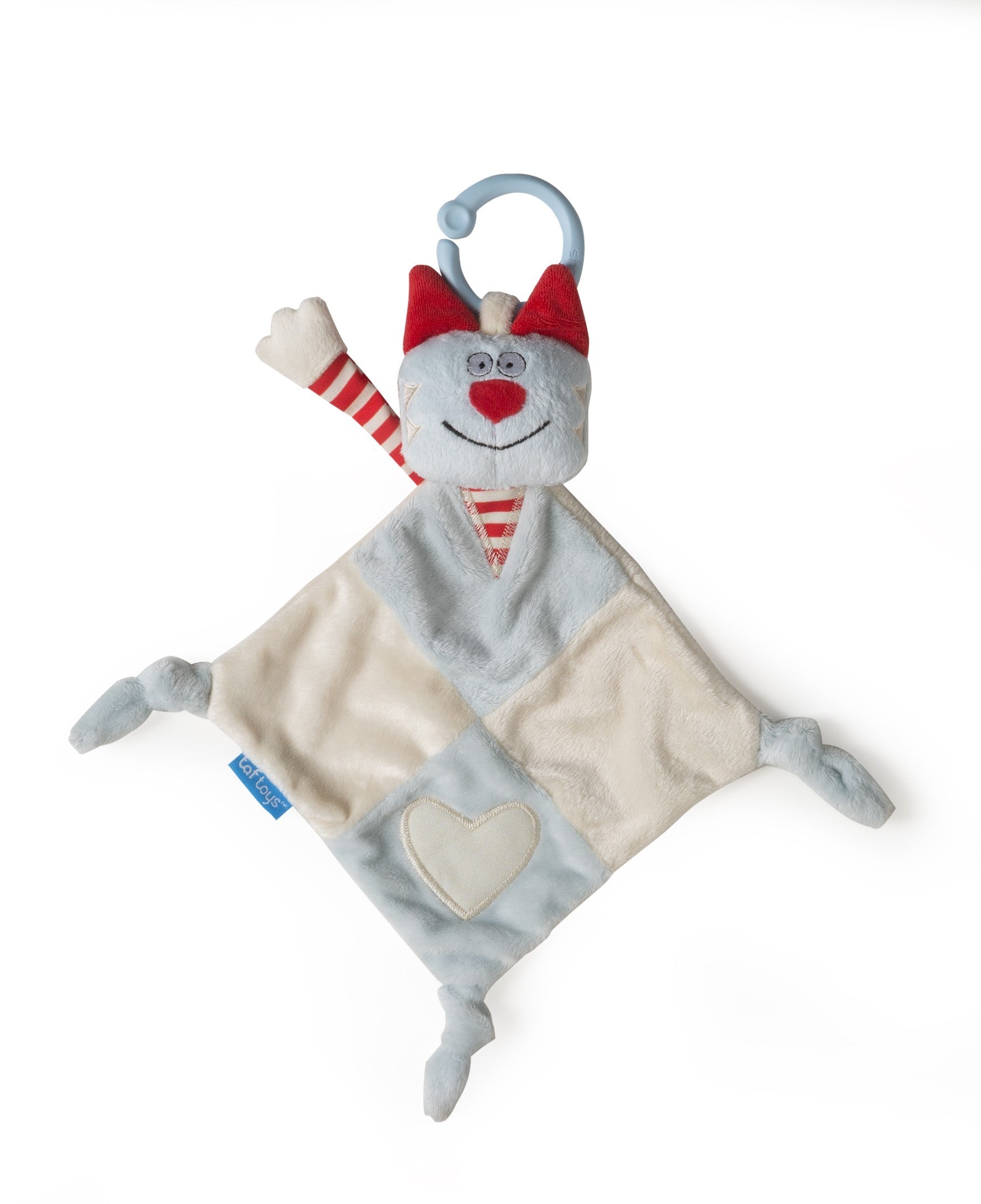 Un doudou tout doux en forme de chat avec un anneau en plastique pour l'accrocher un peu partout !